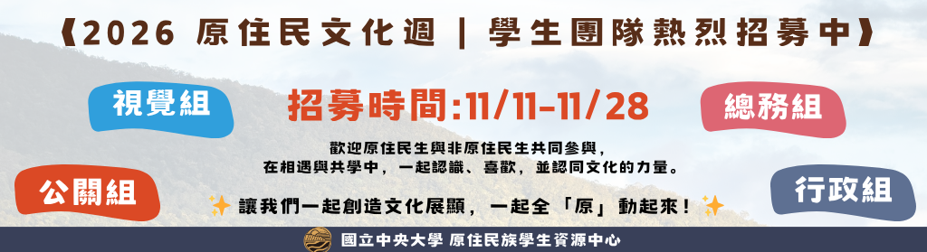 | 2025-11-12 | 校內資訊 | 【2026 原住民文化週|學生團隊熱烈招募中】 | |