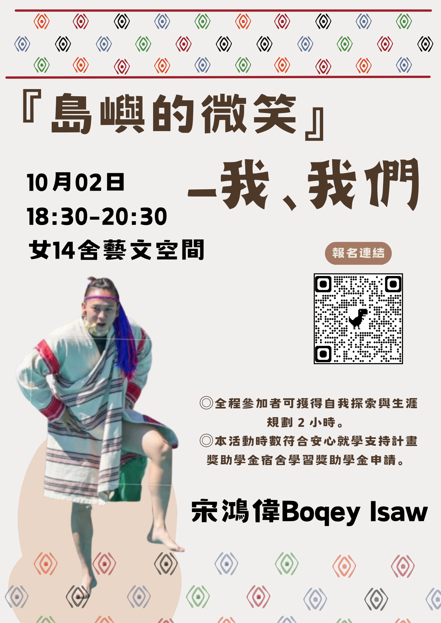 【時間】10月02日(四)18:30-20:30 【地點】女14舍藝文空間 【報名短網址】https://pse.is/8637c2 【講座介紹】 「島嶼的微笑——我、我們」象徵原住民族與台灣的深厚連結。「我」代表個體的文化自覺,承載祖先智慧與土地記憶;「我們」則象徵族群共同體的互助與多元共生。透過原住民族的視角,我們不僅能理解臺灣文化的根源,也能看見不同族群彼此交織出的共同未來。本課程將帶領學生認識原住民族在臺灣歷史、文化與社會中的重要角色,體會島嶼最真實、最溫暖的笑容。 ◎本活動時數可折抵原委會助學金時數 |