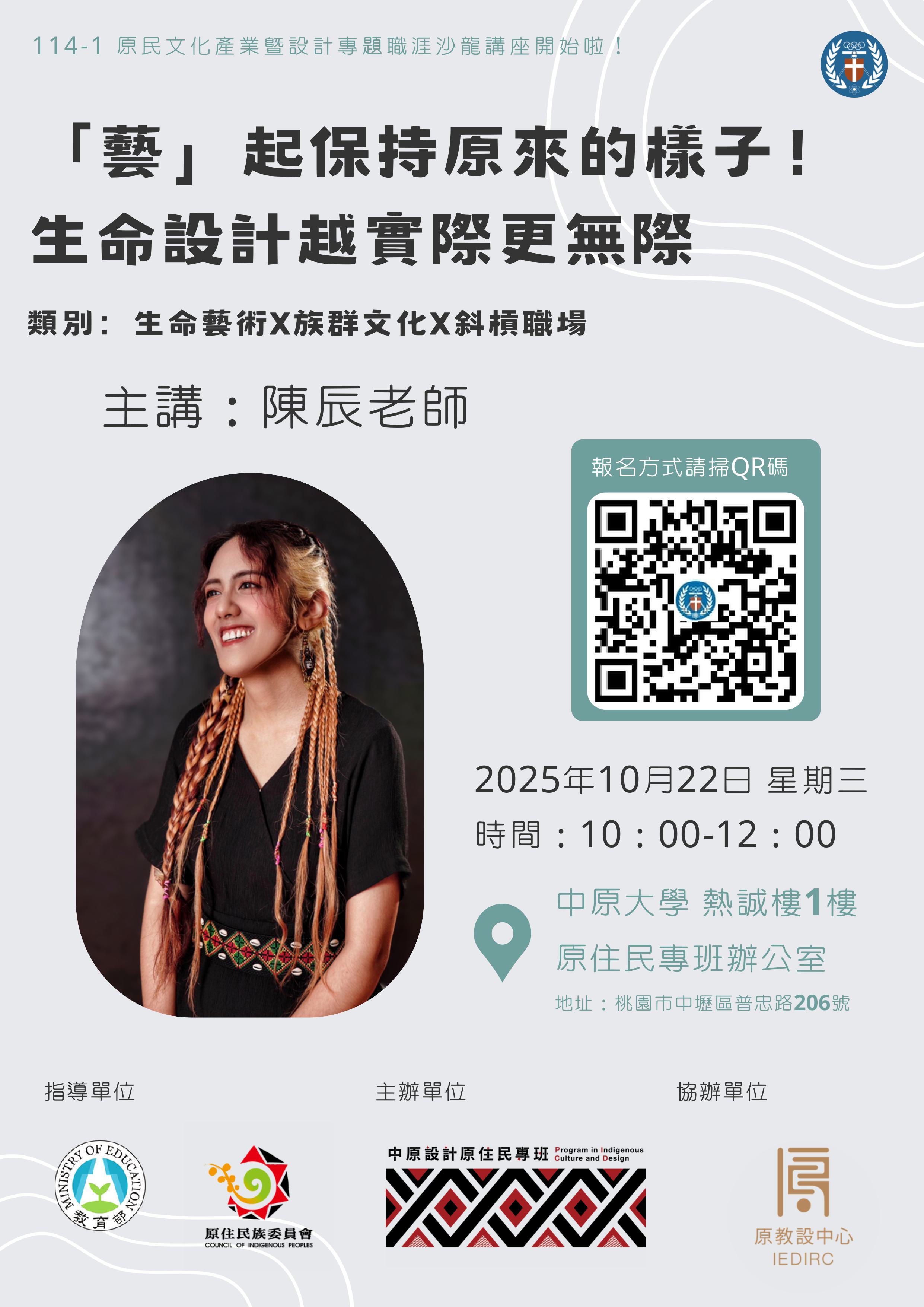 二、講座相關訊息如下: (一)時間:114年10月22日(星期三)10時至12時。 (二)地點:本校熱誠樓1樓設計學士原住民專班辦公室(桃園市中壢區普忠路206號)。 (三)報名網址:https://reurl.cc/gYOLlQ。 (四)講座限額30名,有報名且全程出席者提供午膳。 |