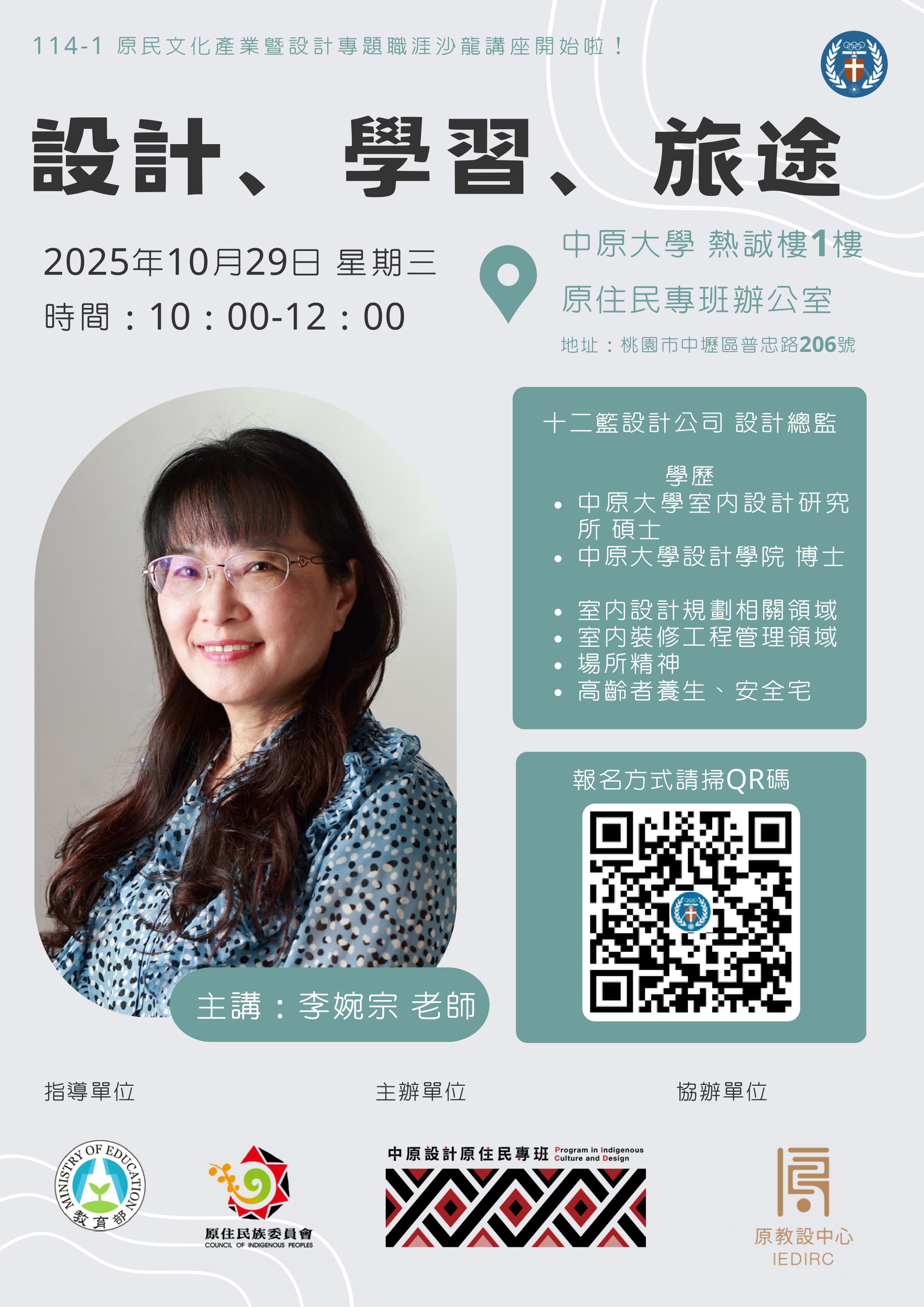 二、講座相關訊息如下: (一)時間:114年10月29日(星期三)10時至12時。 (二)地點:本校熱誠樓1樓設計學士原住民專班辦公室(桃園市中壢區普忠路206號)。 (三)報名網址:https://reurl.cc/jrbD9q。 三、講座限額30名,有報名且全程出席者提供午膳。 |