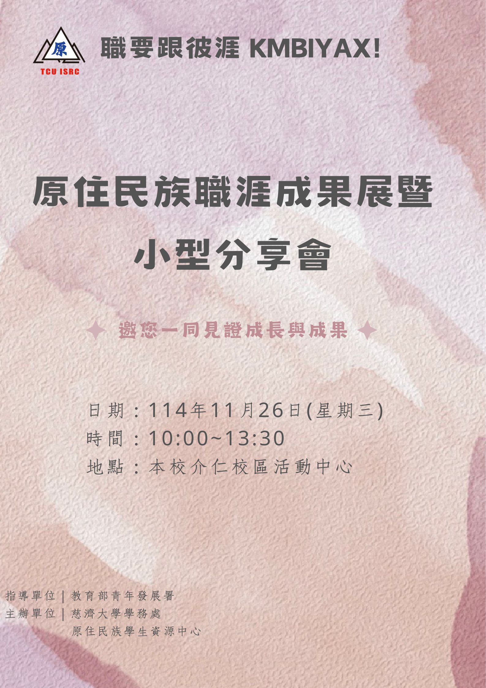 二、為促進本校原住民族學生之職涯探索與成果交流,特結合校慶週辦理「原住民族職涯成果展暨小型分享會」,透過靜態成果展覽及學生經驗分享,使學生藉由回顧學習歷程,深化自我認同與生涯規劃。 三、本次活動特邀原住民族就業服務處設置攤位,辦理現場職涯諮詢與卡牌互動體驗,協助學生認識多元職涯發展方向與就業資源。 四、活動相關資訊如下: (一)日期:114年11月26日(星期三)。 (二)時間:上午10時至下午13時30分。 (三)地點:本校介仁校區學生活動中心。 五、隨文檢附活動海報乙份。如有未盡事宜,請洽承辦人員楊小姐;電話:03-8572677分機31154,E-mail:ss273@gms.tcu.edu.tw。 |