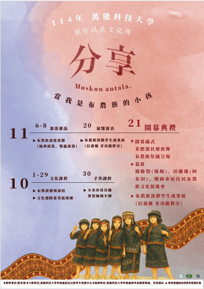 | 公告標題: | 「114年萬能科技大學原住民族文化週-【Muskun antala‧分享】 |
