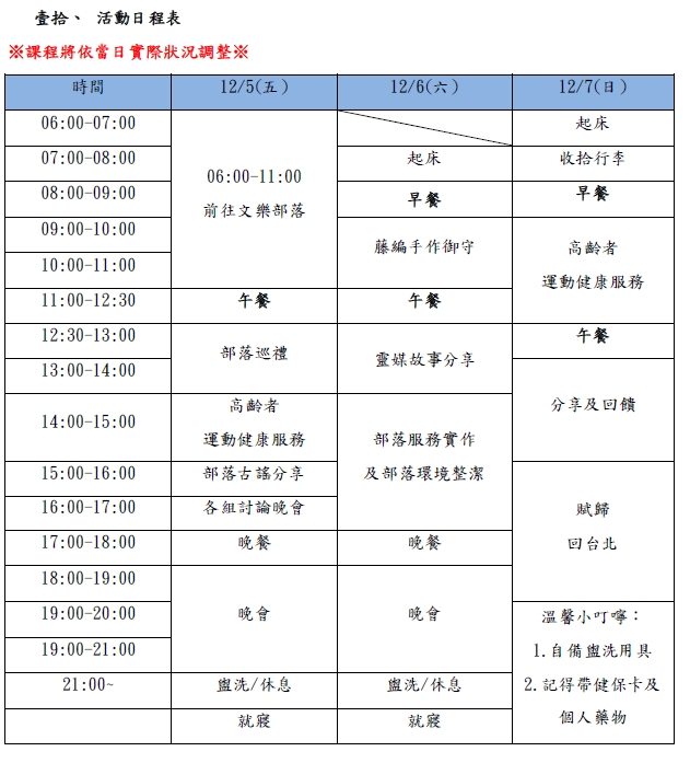 (一)活動時間:114年12月5日(星期五)至12月7日(星期日) (二)活動地點:屏東縣來義鄉 文樂部落 (三)報名方式:採線上報名。 (四)報名時間:即日起至114年11月28日(星期五)止。 (五)本活動預計招收人數:學員30人。 (六)敬請各校於網路系統報名,俾利辦理後續相關作業報名連結:https://forms.gle/RgfKyPfZ8sPiXPko6 (七)報名截止後,本校將於114年11月29日公告確定報名參與名單。 二、聯絡資訊: (一)聯絡人:賴宸笙先生。 (二)連絡電話:(03)328-3201分機8126 (三)電子郵件:kenny220198@ntsu.edu.tw |