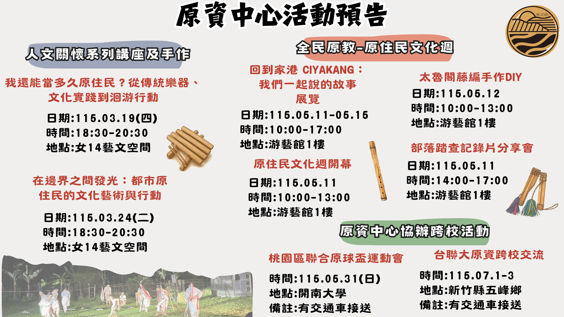 【人文關懷系列講座】 ☀在邊界之間發光:都市原住民的文化藝術與行動 ☀原住民文化週靜態展覽 ▣日期:115.5.11(一)至115.5.19(三) ☀部落踏查記錄片分享會 ☀太魯閣藤編手作DIY ☀文化草地音樂會 ☀桃園區聯合原資小畢典 ☀桃園區聯合原球盃運動會 ☀台聯大原資跨校交流 |